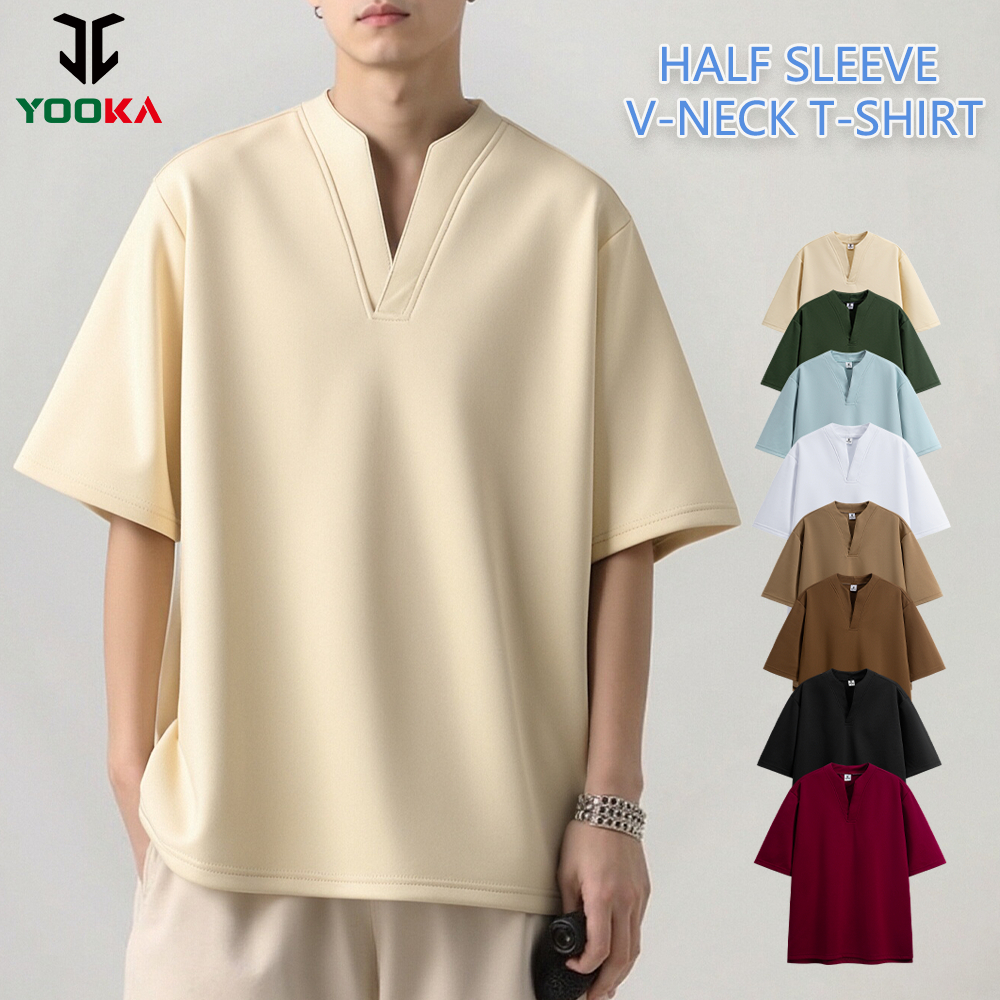 YOOKA Men's Fashion V-neck Half Sleeved T-Shirt Korean Loose Solid Color Tshirt Men's T-Shirt
